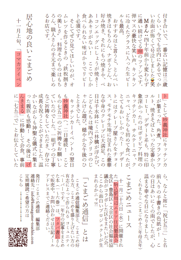 こまごめ通信編集部と、こまごめ好きな方、こまごめを盛り上げたい方の有志によって作られる コミュニティペーパーです。一年分の記事をまとめた本(一~六巻)は、フタバ書店さんで販売中。お問い合わせは下記メールアドレスまでご連絡ください。