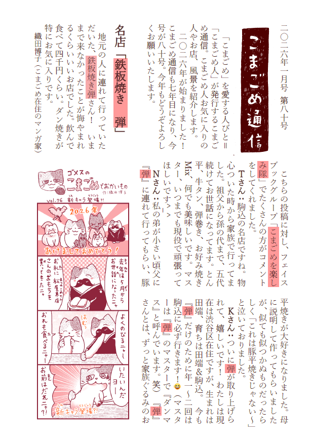 二〇二六年が始まりました! こまごめ通信も七年目になり、今号が八十号。今年もどうぞよろしくお願いいたします。