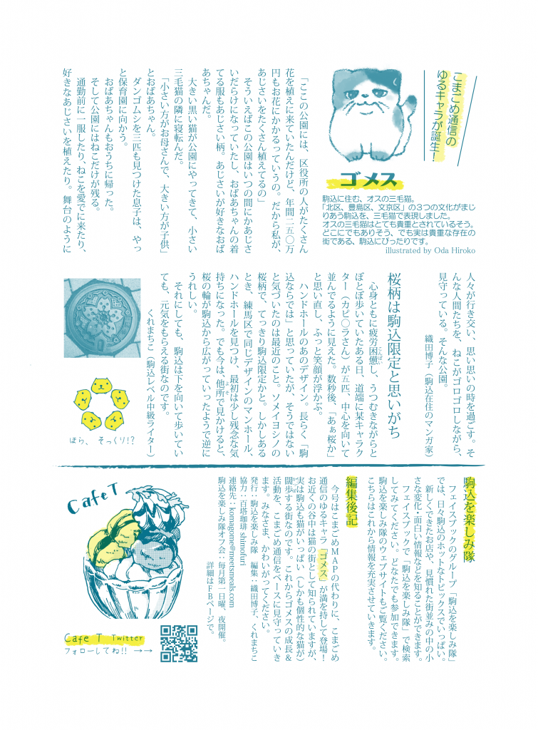 今号はこまごめMAPの代わりに、こまごめ通信のゆるキャラ「ゴメス」が満を持して登場!お近くの谷中は猫の街として知られていますが、実は駒込も猫がいっぱい(しかも個性的な猫が)闊歩する街なのです。これからゴメスの成長&活動を、こまごめ通信をベースに見守っていきます。みなさま、かわいがってください。
