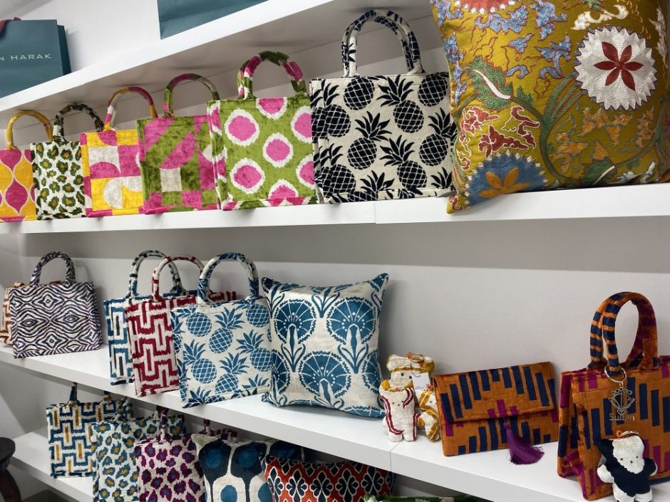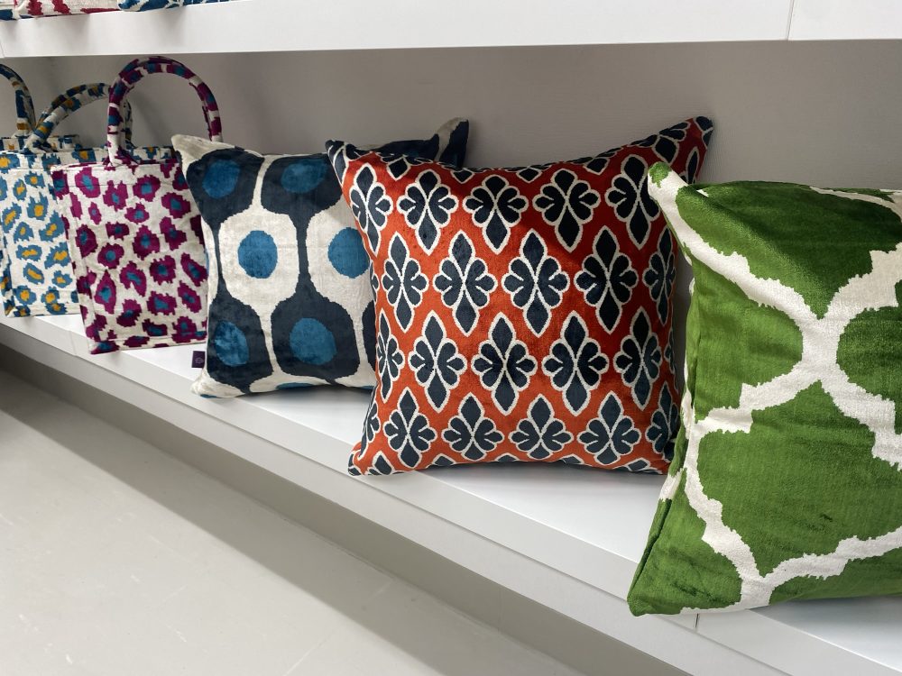 独特の文様のクッションカバーやカバンなどが並ぶインテリアショップみたいニャ。